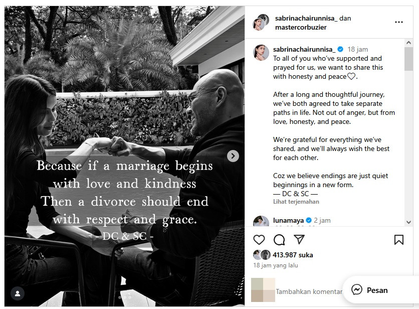 “Dia pria yang baik, dan selalu begitu. Beberapa kisah yang indah terkadang berakhir dengan tenang, tanpa ada siapa pun yang harus disalahkan. Karena perceraian kami bukan tentang pengkhianatan atau kemarahan, melainkan tentang kejujuran,” tulis Sabrina Chairunnisa.